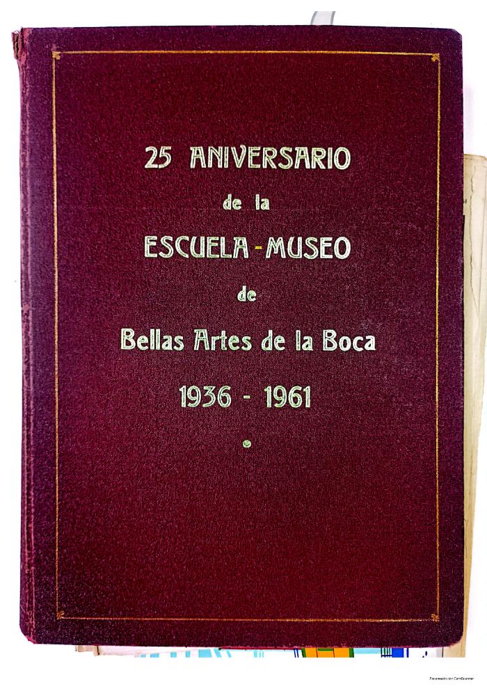 Bibliorato compuesto por el registro del 25 aniversario de la fundación de la institución escolar de educación formal primaria creada por Benito Quinquela Martín en el barrio de La Boca.