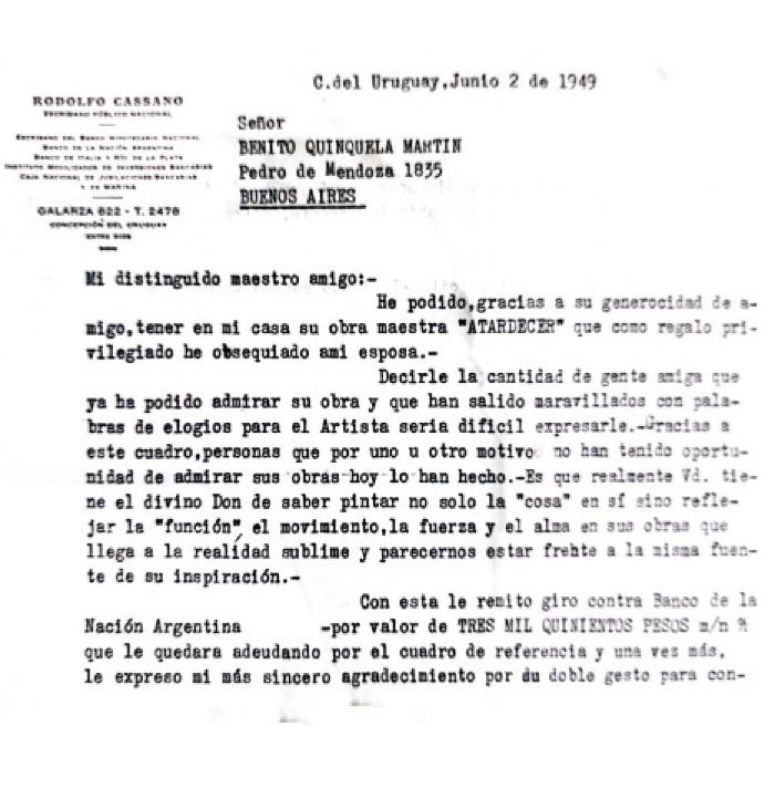 Carta por compra del cuadro Atardecer de Quinquela