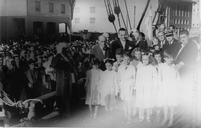 Benito Quinquela Martín y el ministro de educacion Oscar Ivanissevich, noviembre de 1949, a bordo del navío Armandito, en frente a Palos y Av. Pedro de Mendoza, a pocos metros del museo creado por el artista.