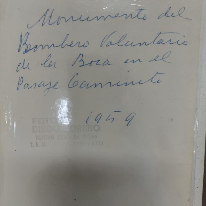 Fotografía de la obra de Ernesto Scaglia (1892 - 1983) en bronce de 210 x 90 x 64 cm, de 1958. Este escultor pasaba a bronce obras de escultores argentinos como Rogelio Yrurtia. Enseñó a Antonio Pujía. El monumento fue donado por los Bomberos Voluntarios de La Boca y colocado en el ingreso a Caminito.