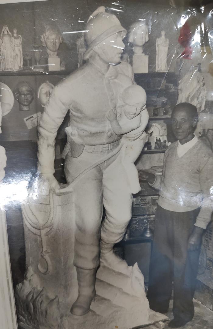 Ernesto Scaglia con la escultura del Bombero voluntario en Caminito