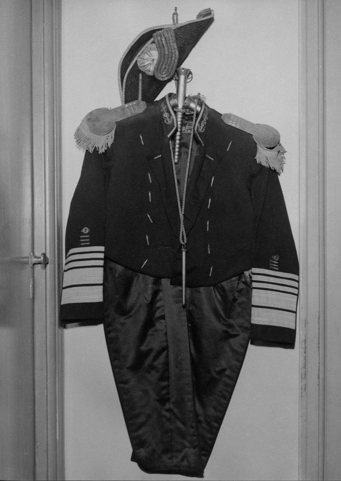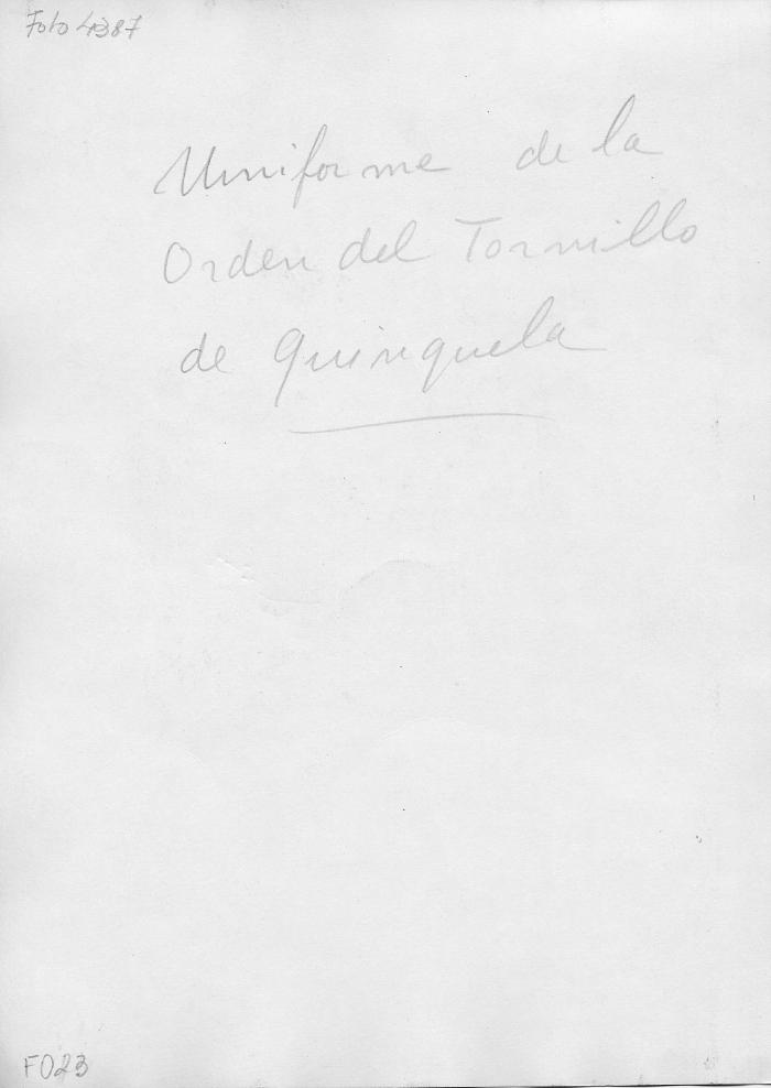 Traje utilizado por BQM para sus ceremonias de la Orden el TornilloSombrero bicornio perteneciente a BQM, a su traje de la Orden del TornilloTornillo simbólico (alusivo a Orden del Tornillo), lustrado con cordel azul y amarilloQuinquela